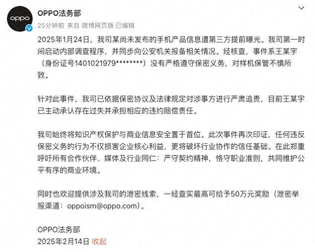 2月14日,@OPPO法务部 再次就此前泄露新机事件发布声明称,1月24日,我司某尚未发布的手机产品信息遭第三方提前曝光。我司第一时间启动内部调查程序,并同步向公安机关报备相关情况。经核查,事件系王某宇(身份证号1401021979********)没有严格遵守保密义务,对样机保管不慎所致。
